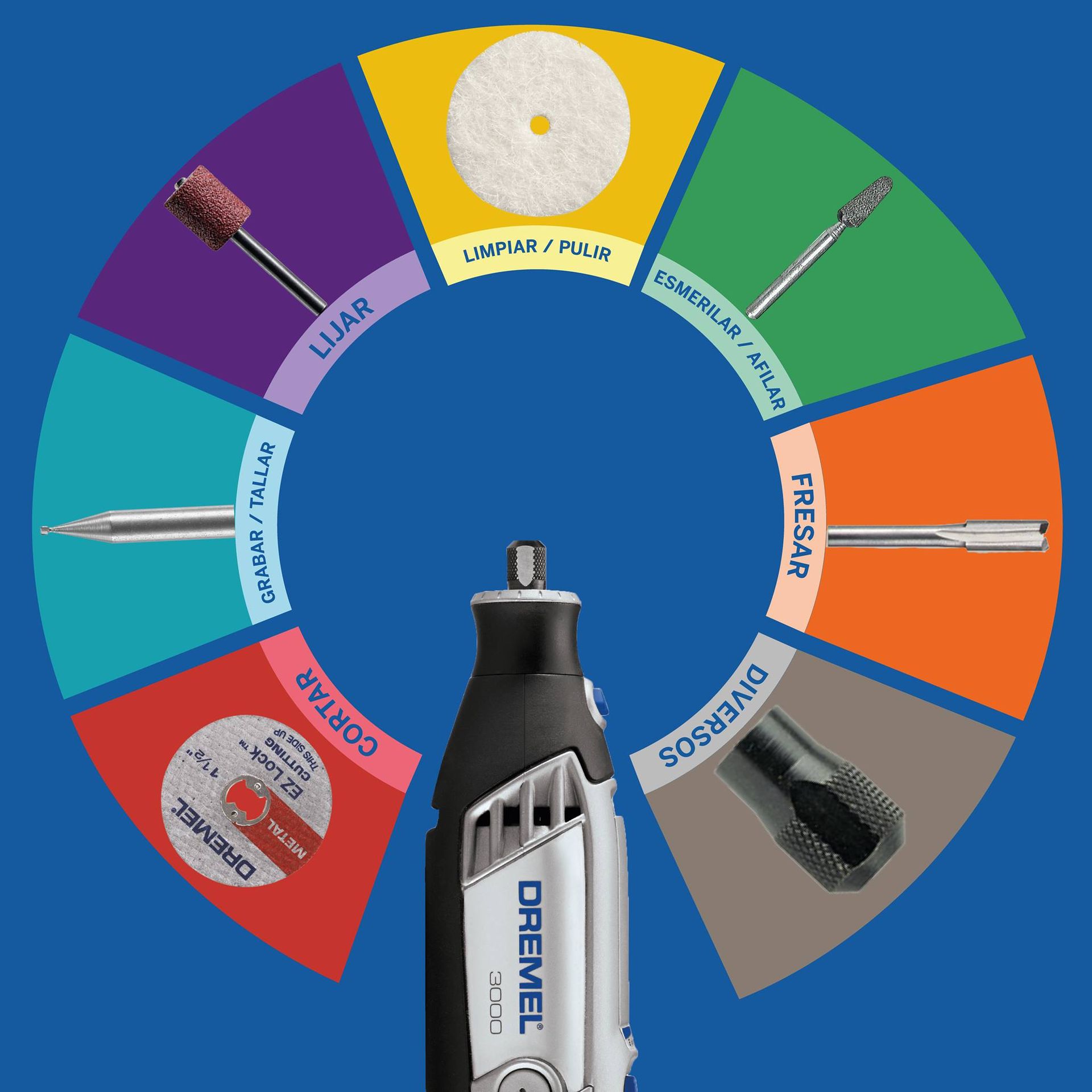 ¿Sabías que Dremel tiene accesorios para más de 10 aplicaciones diferentes? Y cada uno de ellos tiene su propio color, ¡Así es más fácil de identificar!